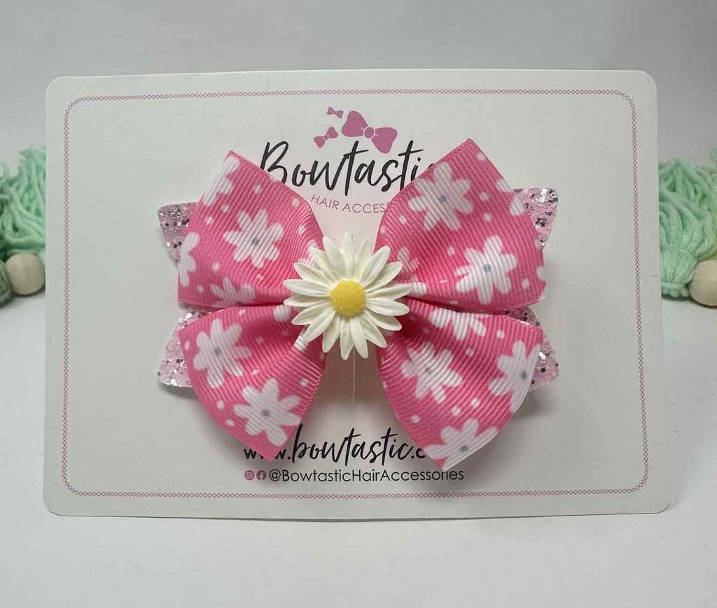3.5 inch Pink & White Daisy Glitter Bow
