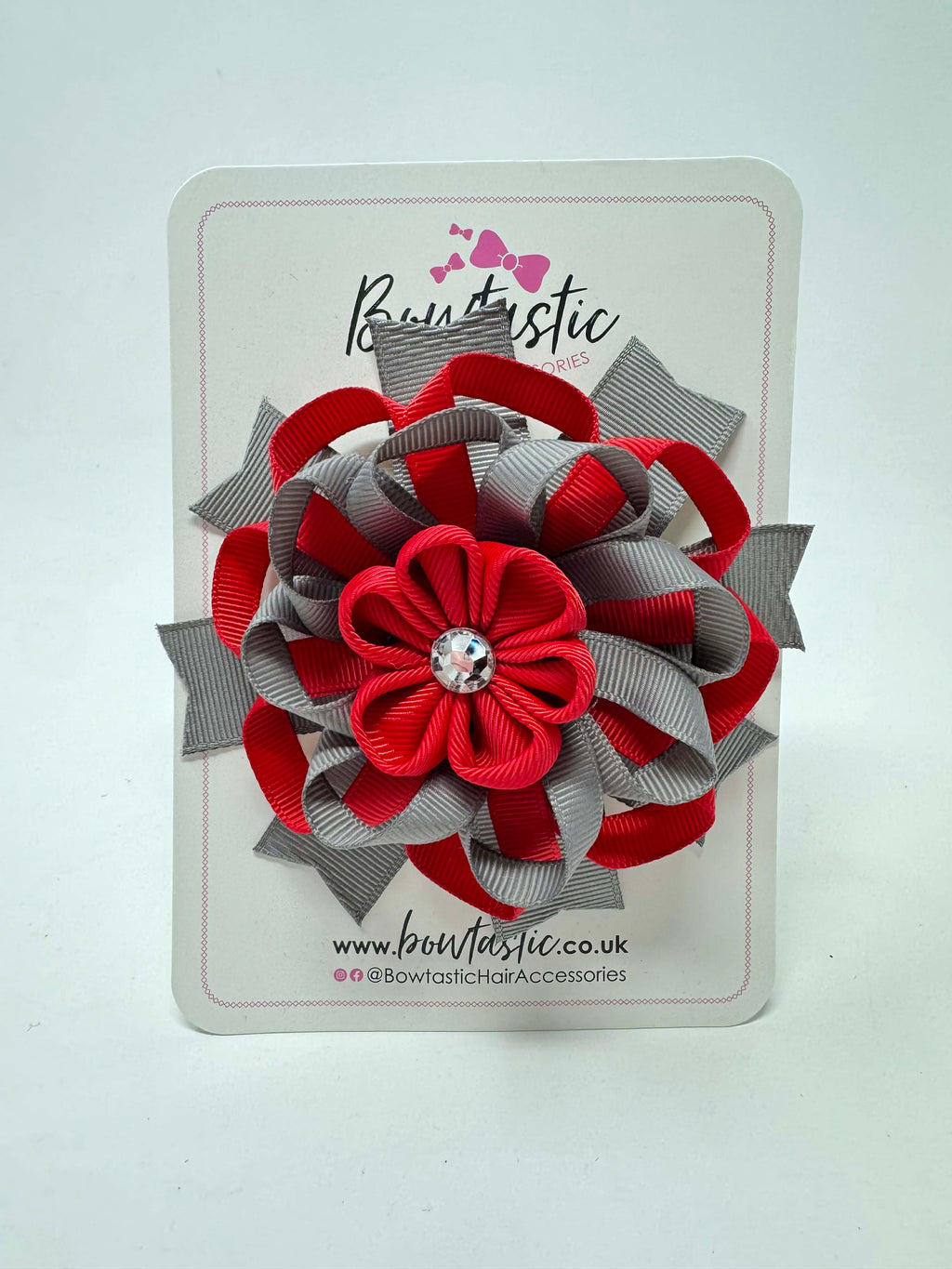 4 Inch Flower Bow - Red & Metal Grey