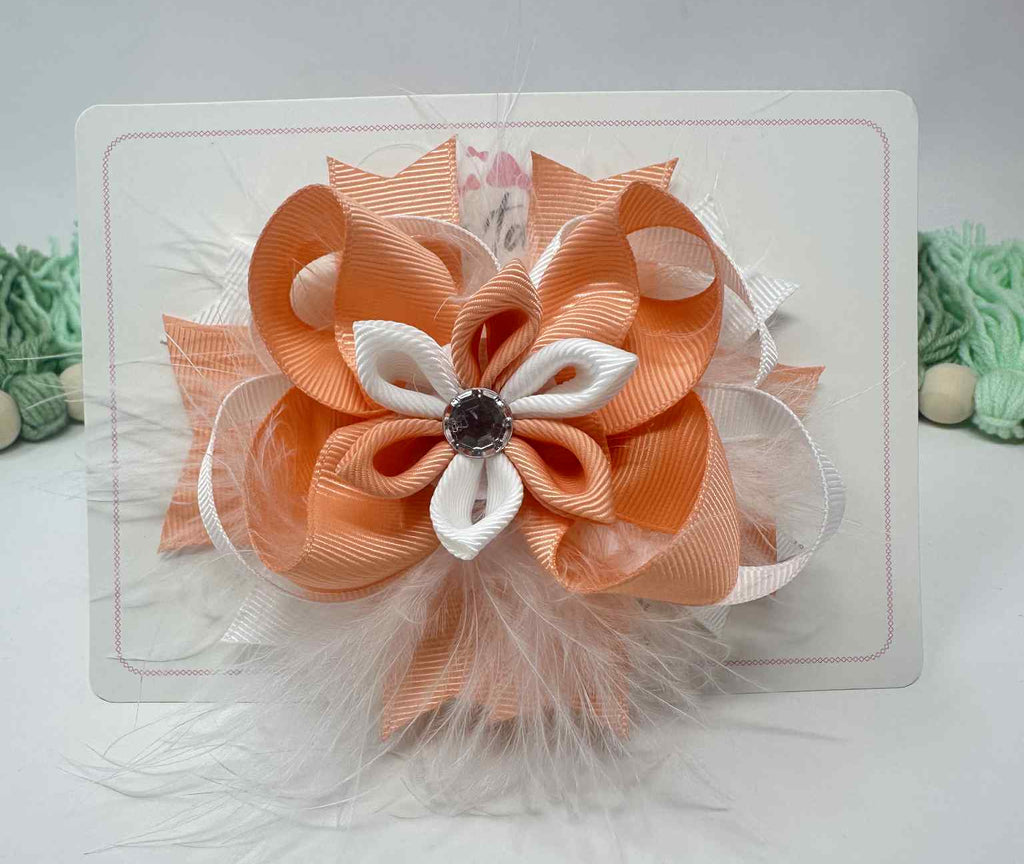 4 inch Fluffy Flower Bow - Peach & White Polka Dot