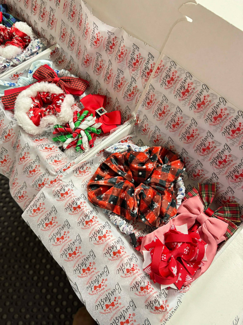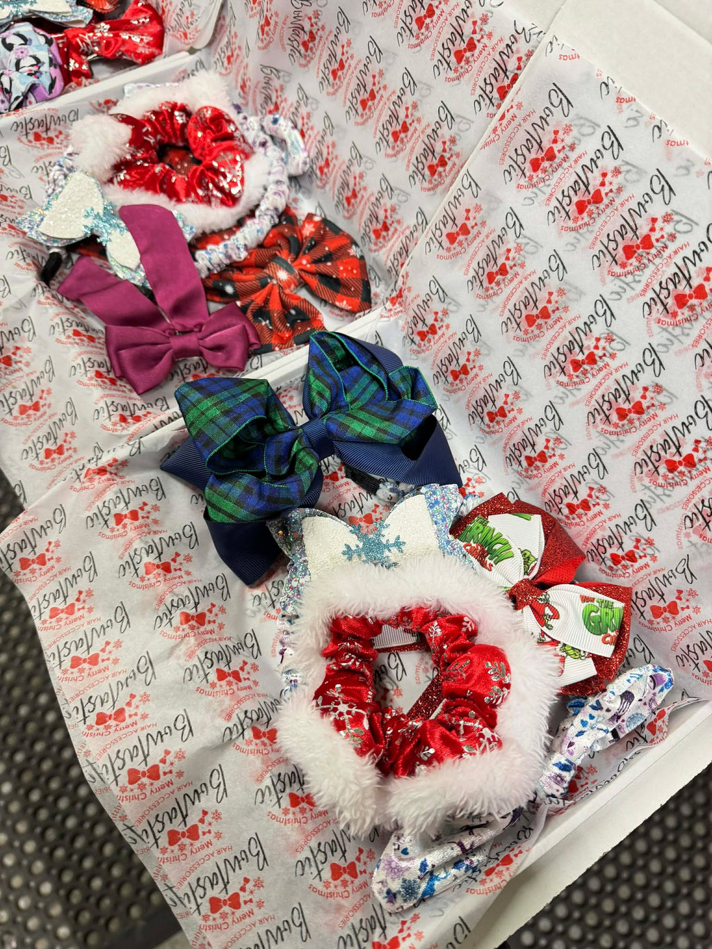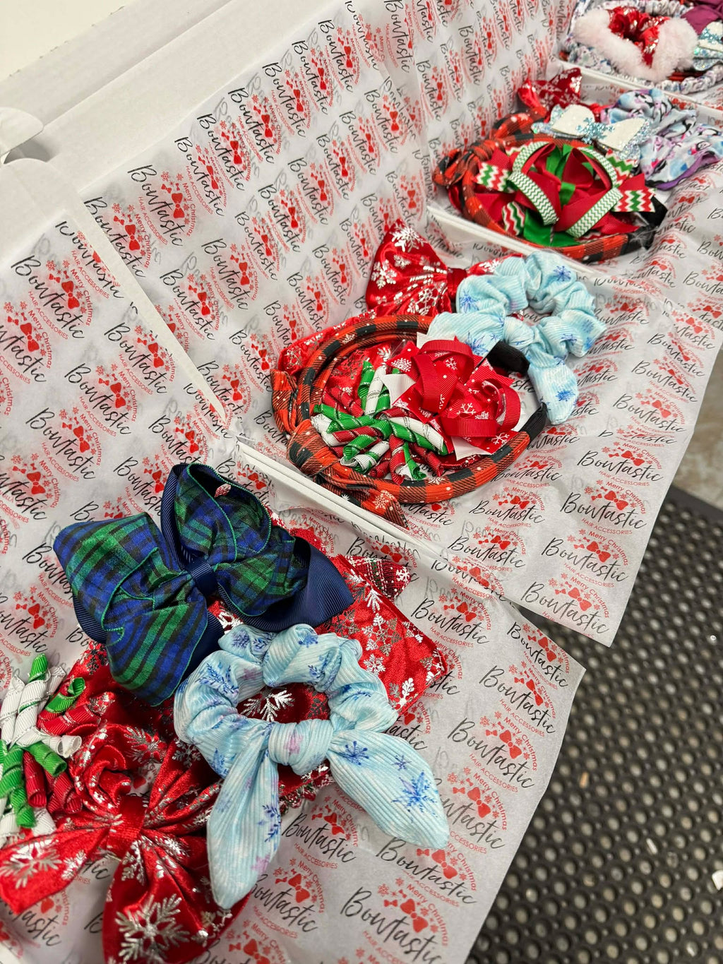 Pictures shown are examples only. Bundles will include a mix of the following - satin bows, tartan bows, christmas printed, red/green/white or red/gold bows, novelty clips, headbands, scrunchies, corkers - bundles will include a mix of small, medium and large items.