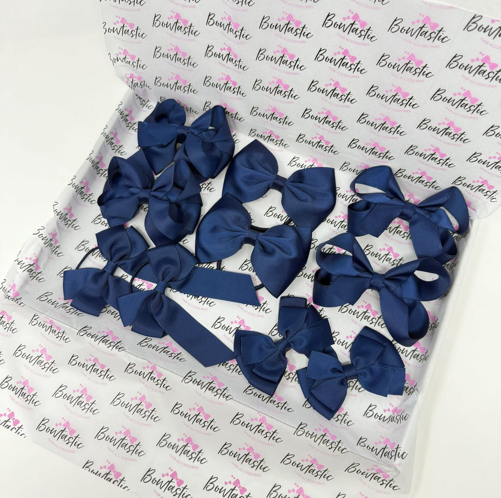 Bundle includes 10 hair bows in a range of styles & sizes. The picture shown is the styles you will receive. You will receive 5 matching pairs in the colour listed.